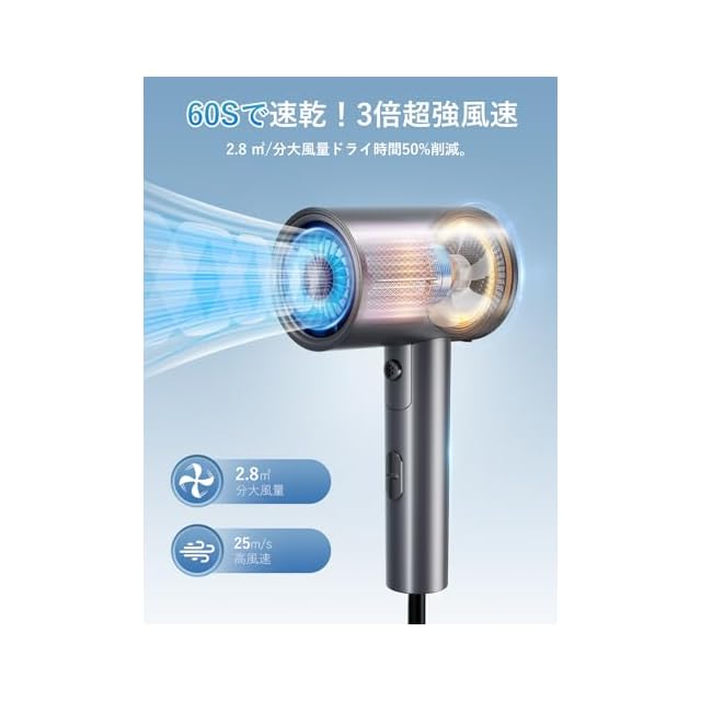 【3倍超強風&60S速乾】ドライヤー 110,000rpm 高速ブラシレスモーターを搭載し、3 倍超強風を実現。髪表面の水分を瞬時に除去し、乾燥時間を 50% 短縮 ——60 秒でショートヘアを速乾できるため、忙しい朝もスムーズに髪を仕上げ、すっきりと外出できます。
