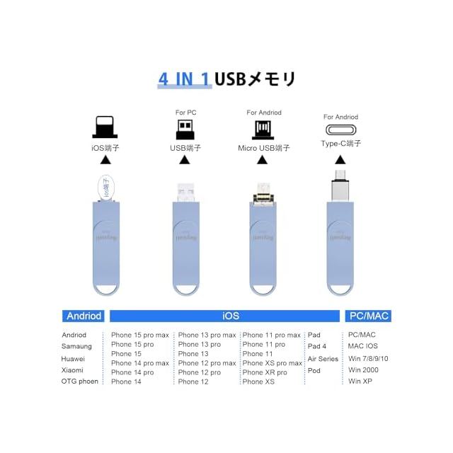 【多機種対応】 USBメモリ にはiOS、USB、type-c、micro USBの機種の接続タイプが4種も使用出来るので、PC/Android/MacBook/iOSで簡単にデータ バックアップです。 lightnin9 usbメモリはPhone 15 Pro Max/15 Pro/15 Plus/15/14 Pro Max/14 Pro/14 Plus/14/SE 3/13 Pro Max/13 Pro /13/13 mini /12 Pro Max/12 Pro/12 /SE 2 /11 Pro Max/11 Pro/11 /XR/XS Max/XS /X /8 Plus/8/i Pad Air(第1/2/3世代)/ MacBook(Pro/Air)/iPad mini(第1/2/3/4/5世代)/i Pad(第5/6/7/8/9世代)全シリーズ/ パソコン/ Type-Cスマホ/ Androidスマホ /タブレットなどとデータ移行 互換性のあるusbメモリ。