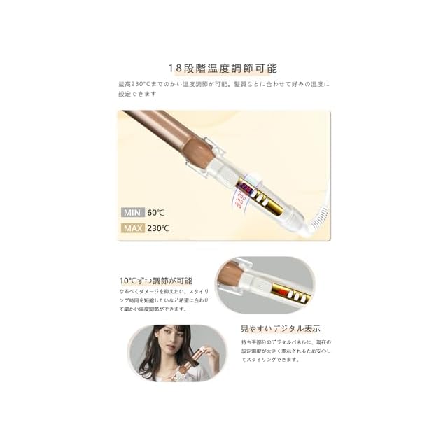 【みずみずしく弾む目を奪うほど美しいカール】最高温度230℃のプロ仕様で、60℃~230℃まで、10℃ごとに18段階で温度調整が可能です。髪質やヘアスタイルに応じて切り替えられるのが便利です。VAPAKAのカールアイロンは、髪をやさしく包み、均一に熱を伝えることでみずみずしく弾む立体的なカールを生み出します。毎朝のスタイリングはもちろん、大事なイベントの日、雨で湿気の多い日、デート、パーティ・・・髪をバッチリ決めたいシーンにしっかりとスタイルが決まる。