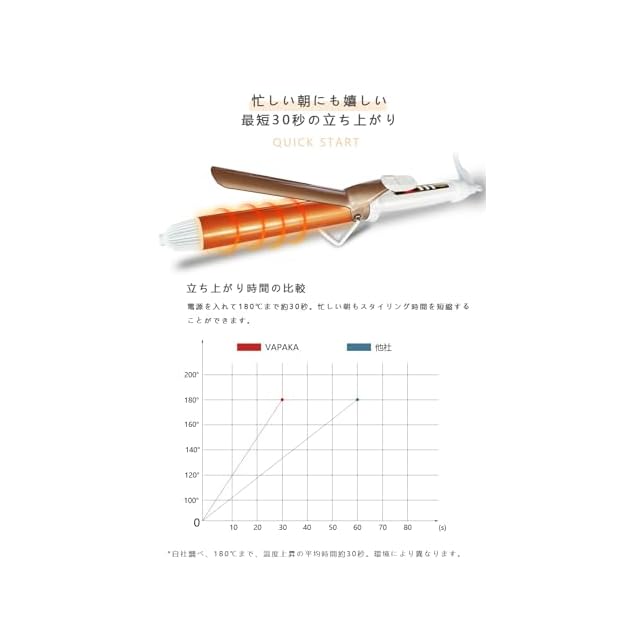 【熱効率高い・夜までキープ】熱効率の高いヒーターを2枚使用して、電源を入れてから約35秒で使用可能な温度までスピーディーに到達(※180度に到達するまでの時間)。朝の忙しいスタイリング時間の短縮につながります。カールが崩れやすくなる要因のひとつは、髪の水分を飛ばしすぎてしまうこと。VAPAKA カールアイロン コテは、水分を過剰に飛ばさずので、時間がたってもれにくく、美しいカルがつづきます。機能性を高めたカールアイロンで今までにないしなやかでツヤのある弾むようなカールを実感してください!