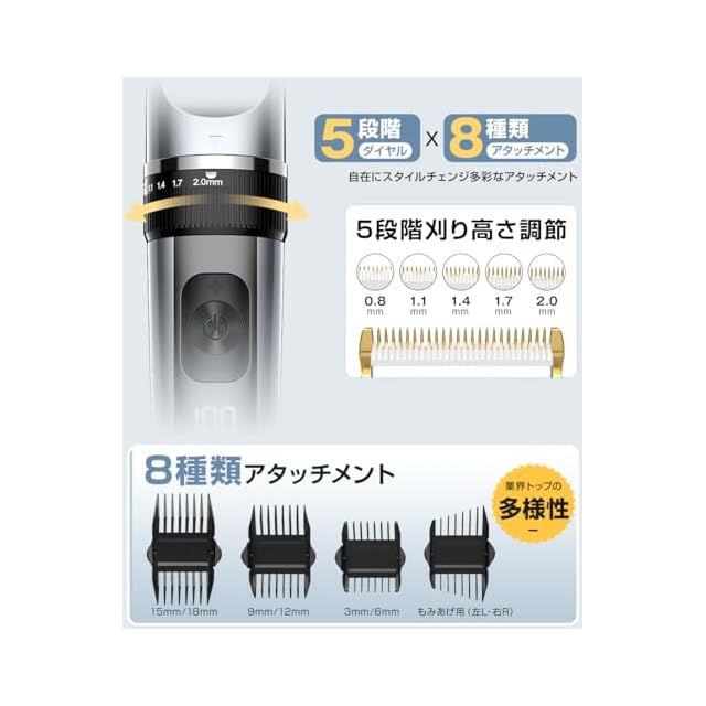 【5段階刈り高さ調整&8種類ガイドコーム】本製品は、0.8mm〜2.0mmまでの5段階刈り高さ調整機能と、3mm〜19mmの8種類ガイドコームを搭載。 坊主用バリカン や ツーブロック用バリカン として、またもみあげ トリマーにも最適で、セルフカット初心者でも簡単に理想のヘアスタイルが実現できます。防水仕様のため、 バリカン メンズ 防水モデル としてお風呂場での使用も可能。水洗いできるのでお手入れも簡単で衛生的です。プロ仕様の バリカン おすすめ アイテムとして、家族全員の ヘアカッター に活躍します。さらに、軽量コンパクトで持ちやすく、操作もシンプル。自宅でのヘアカットや散髪が手軽にでき、忙しい方や 子供のカット にもぴったりです。毎日のスタイリングに役立つ高性能な 電動バリカン です。