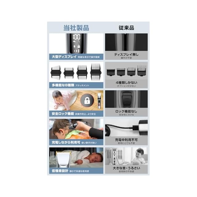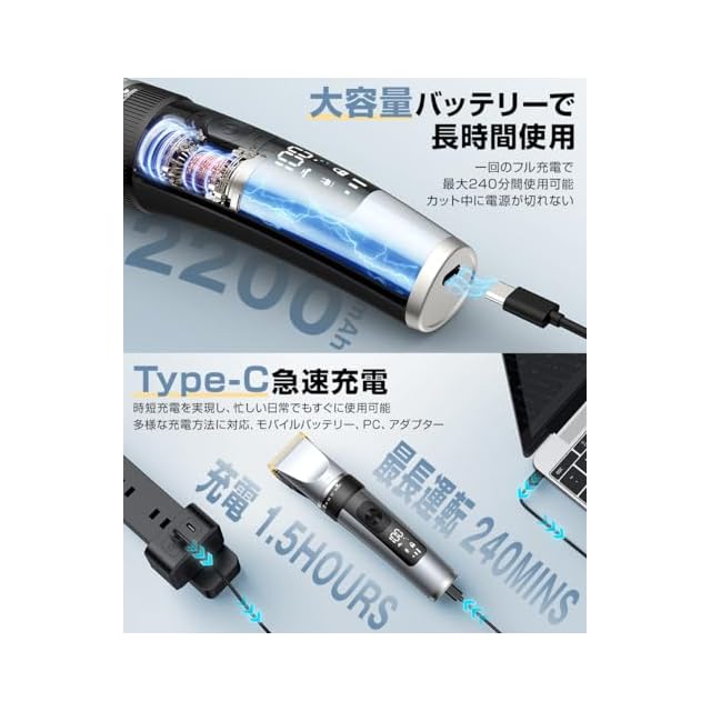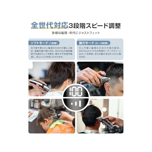 【LED大型ディスプレイ&安全ロック機能で操作も安心快適】本体には見やすいLEDディスプレイを搭載し、バッテリー残量やスピードモード、充電状況がひと目で確認可能。さらに安全ロック機能付きで誤作動を防止し、お子様のいる家庭でも安心して使用できます。 バリカン 防水仕様 でお風呂場でも使いやすく、髪やもみあげの細かい仕上げにも対応。防水設計+静音モーターで、夜間の使用も気兼ねなく行えます。コンパクトながら多機能で、 hair clipper や 電動バリカン 、トリマーとしても高評価。日常使いはもちろん、 子供 バリカン としての使用にも適した、安全性と使いやすさを兼ね備えた1台です。