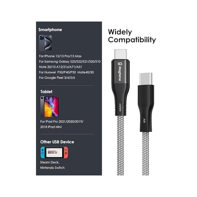 高耐久48番手二重ナイロン、3次元編み込み技術:Magtameタイプシーケーブルは高耐久48番手の二重ナイロン4層構造を高密度編組で耐久力に強化しています。更に3次元の編み込み技術により断裂を防ぐタイプcタイプcです。