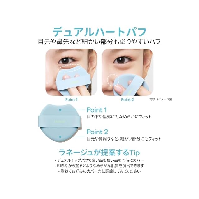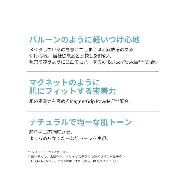 ✅【「エアリーシームレステクノロジー 」を採用し、軽やかに密着】 ラネージュ独自の「シームレステクノロジー」がさらに進化。15万回転でブレンドされた超微粒子が、肌表面に薄く均一に密着し、少量の塗布でも美しい仕上がりを実現します。また、従来より3倍軽く*⁷なった「Air Balloon Powder*⁸」と肌との密着を高める「MagnetGrip Powder*⁹」を配合。何度塗りなおしても厚塗り感が出にくく、シミ・毛穴の凸凹、赤み等の肌悩みをナチュラルにカバーしながら、肌にピタっと密着し、崩れにくい仕上がりに。軽やかなつけ心地で、素肌そのものが美しくなったような自然な肌印象を演出します。