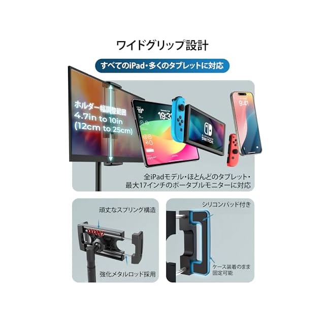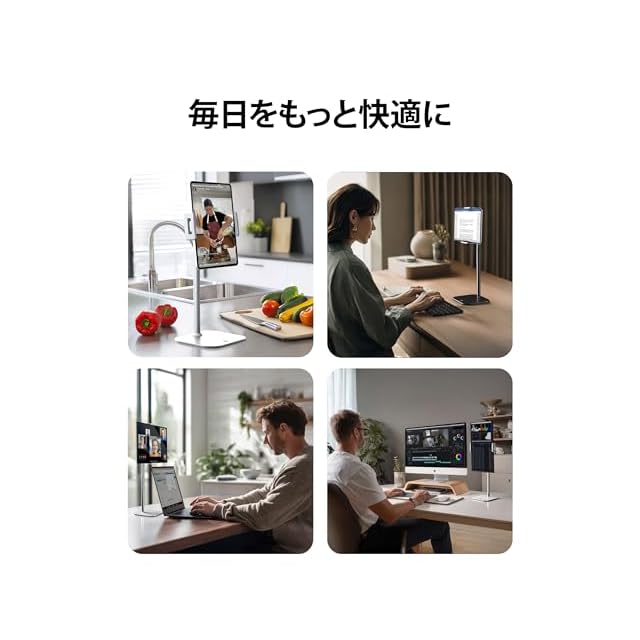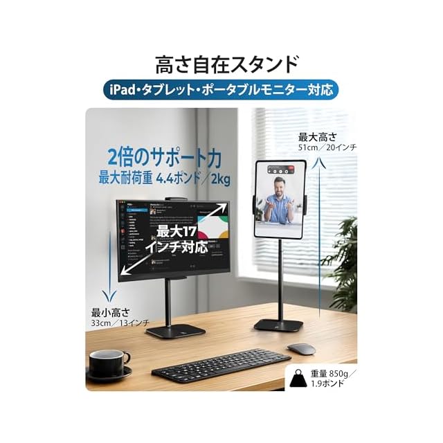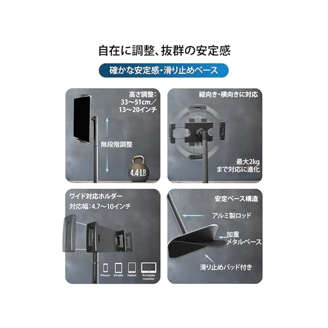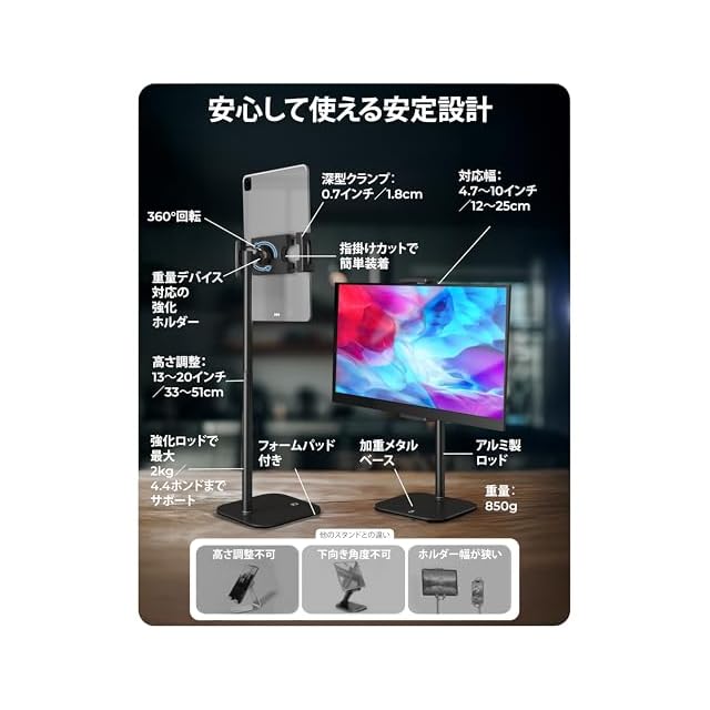 多彩なビューイング - iPad専用スタンドは、高さを13~20インチ(33cm-51cm)に調節可能。4.7~10インチ幅のデバイスを、ケースを付けたままでもしっかりと固定できます。モニターホルダー、iPad Airスタンド、iPad Proスタンドとして使用できます。
