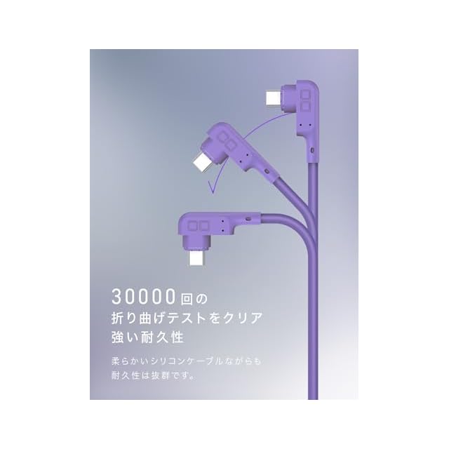 【しなやか過ぎて絡まない、折り曲げテスト30,000回クリアのシリコンケーブル】外装にシリコン素材を使用したことで、従来のケーブルにはない柔らかい質感を実現しました。優しい使い心地をご体感ください。カバンやポケットに入れても絡みにくく、出し入れもスムーズに行えます。折り癖や巻き癖が付きにくいため、いつでもストレスフリーにご使用いただけます。30,000回の折り曲げテストを実施し、断線しにくい優れた耐久性を実現。ケーブル内部のワイヤーを断線から保護し、安心して急速/高速充電することが出来ます。