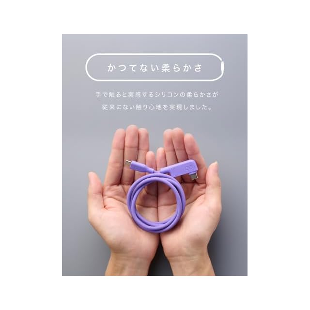【しなやか過ぎて絡まない、折り曲げテスト30,000回クリアのシリコンケーブル】外装にシリコン素材を使用したことで、従来のケーブルにはない柔らかい質感を実現しました。優しい使い心地をご体感ください。カバンやポケットに入れても絡みにくく、出し入れもスムーズに行えます。折り癖や巻き癖が付きにくいため、いつでもストレスフリーにご使用いただけます。30,000回の折り曲げテストを実施し、断線しにくい優れた耐久性を実現。ケーブル内部のワイヤーを断線から保護し、安心して急速/高速充電することが出来ます。