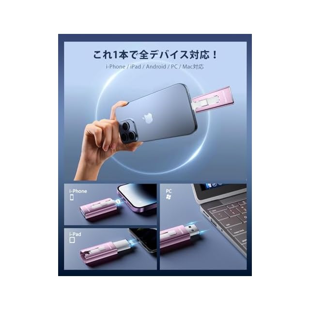 【アプリ不要!Phoneから直接usbメモリに写真保存できる神アイテム】このPhone対応usbメモリは、専用アプリ不要で、PhoneやiPad、Androidスマホ、Windows PC、Macに直接接続できるため、複雑な設定やネット環境がなくてもPhoneの写真や動画を即座に保存できます。操作も「接続→選択→保存」の簡単3ステップで、機械に不慣れな方でも使いやすいです。Phoneてテータ保存usbとして、iCloudに頼らずに旅先や日常の思い出をスマートにバックアップできる便利なスマホusbメモリです。