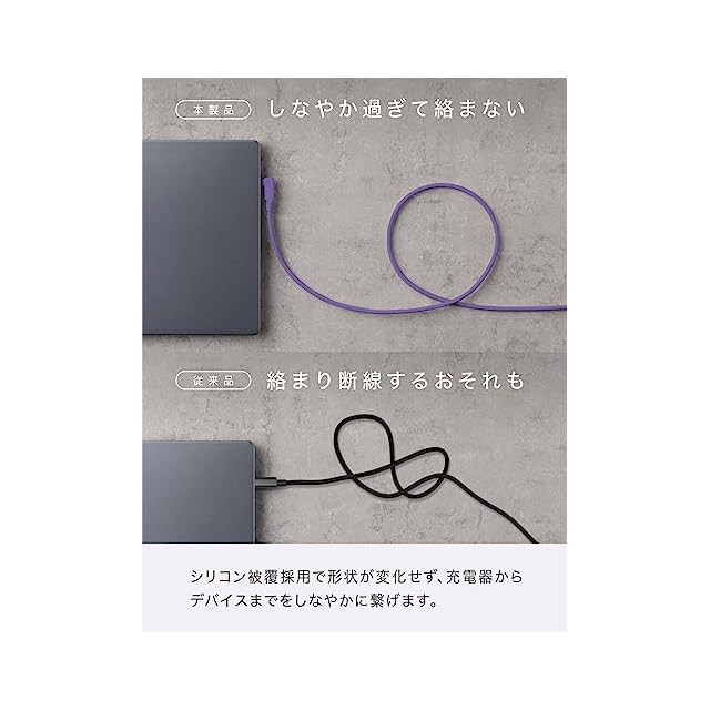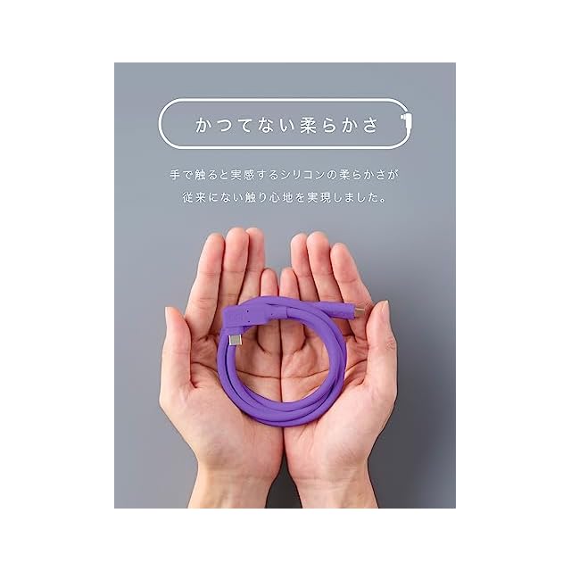 【しなやかなシリコン素材】外装にシリコン素材を使用したことで、従来のケーブルにはない柔らかい質感を実現しました。優しい使い心地をご体感ください。カバンやポケットに入れても絡みにくく、出し入れもスムーズに行えます。折り癖や巻き癖が付きにくいため、いつでもストレスフリーにご使用いただけます。