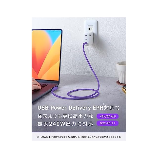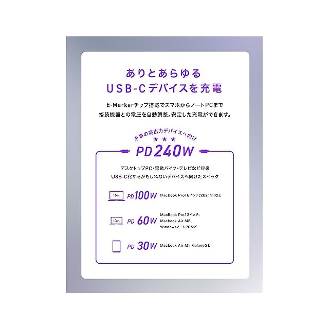 【USB Power Delivery EPR(PD3.1)対応】従来の100Wよりも更に早い最大240Wに対応。MacbookやWindows等のハイエンドノートPCから大容量モバイルバッテリー等ありとあらゆるデバイスを最速で充電可能です。※100W以上の出力で充電する際はPD EPRに対応したAC充電器が必要です。お持ちでない方はCIOが販売するNovaPort TRIO(CIO-G140W3CE)がオススメです。
