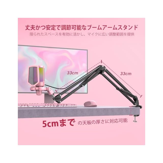 【耐震性高いショックマウントとマイク本体】軽量化にデザインされたマイク本体の下部は、弾力性のゴムバンドでショックマウントに固定され、どの方向からの振動も吸収でき、録音への影響を最大限に低減します。調節簡単な卓上ブームアームマイクスタンドはマイクをご愛用の姿勢まで調整する可能性を提供します。