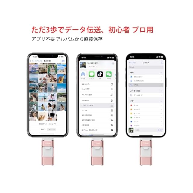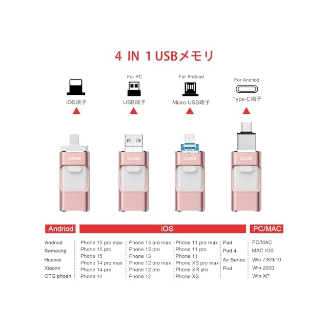 【多機種対応】 USBメモリ にはiOS、USB、type-c、micro USBの機種の接続タイプが4種も使用出来るので、PC/Android/MacBook/iOSで簡単にデータ バックアップです。 usbメモリはPhone 15 Pro Max/15 Pro/15 Plus/15/14 Pro Max/14 Pro/14 Plus/14/SE 3/13 Pro Max/13 Pro /13/13 mini /12 Pro Max/12 Pro/12 /SE 2 /11 Pro Max/11 Pro/11 /XR/XS Max/XS /X /8 Plus/8/i Pad Air(第1/2/3世代)/ MacBook(Pro/Air)/iPad mini(第1/2/3/4/5世代)/i Pad(第5/6/7/8/9世代)全シリーズ/ パソコン/ Type-Cスマホ/ Androidスマホ /タブレットなどとデータ移行 互換性のあるusbメモリ。
