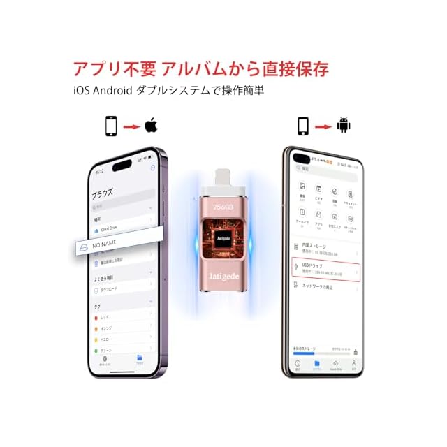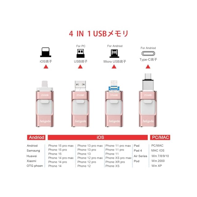 【多機種対応】 USBメモリ にはiOS、USB、type-c、micro USBの機種の接続タイプが4種も使用出来るので、PC/Android/MacBook/iOSで簡単にデータ バックアップです。 usbメモリはPhone 15 Pro Max/15 Pro/15 Plus/15/14 Pro Max/14 Pro/14 Plus/14/SE 3/13 Pro Max/13 Pro /13/13 mini /12 Pro Max/12 Pro/12 /SE 2 /11 Pro Max/11 Pro/11 /XR/XS Max/XS /X /8 Plus/8/i Pad Air(第1/2/3世代)/ MacBook(Pro/Air)/iPad mini(第1/2/3/4/5世代)/i Pad(第5/6/7/8/9世代)全シリーズ/ パソコン/ Type-Cスマホ/ Androidスマホ /タブレットなどとデータ移行 互換性のあるusbメモリ。