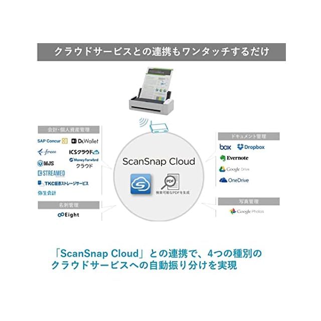 オフィスやホームなど、Wi-Fi環境がある場所では、アクセスポイント経由でコンピューター、スマートデバイスと接続します。また、「ScanSnap Cloud」との連携で、クラウドサービスへの直接保存を実現。4つの原稿種別に割り当てたクラウドサービスへ自動振り分けいたします。
