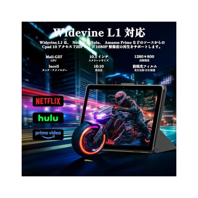 【鮮やかな表示、優れた視覚体験】このタブレットPCは、1280×800の高解像度Incell IPSスクリーンを採用し、明るく鮮やかな表示で映像や文字がくっきりと見やすくなっています。画面比率は16:10の黄金比で、映画鑑賞や電子書籍の閲覧にも最適。さらに、グラフィックス処理を支えるMali-G57 GPUを搭載し、滑らかな映像表現を実現します。Widevine L1認証を取得しており、NetflixやYouTubeなどのストリーミングサービスで高画質動画を楽しむことができ、通勤中やおうち時間にリラックスしてエンタメ体験を満喫できます。