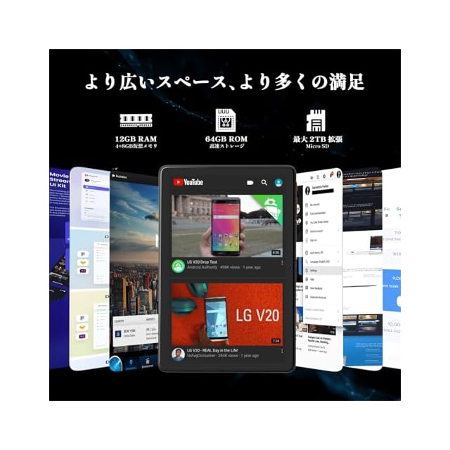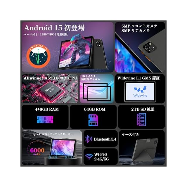 【最新Android 15 OS!スムーズな体験】このタブレット10インチは、最新のAndroid 15 OSを搭載し、操作がさらにスムーズに。アプリの起動や切り替えが高速で、使いやすさが大幅に向上しました。セキュリティとプライバシー機能も強化され、安心して長くご使用いただける最新モデルです。また、高性能の8コアCPU(A523)を搭載し、最大1.8GHzの高速処理で、YouTube視聴やWebブラウジング、オンライン授業、簡単なゲームも快適に楽しめます。加えて、12GB(4GB+8GBの仮想メモリ)のメモリにより複数アプリの同時使用もスムーズ。さらに、64GBの本体ストレージに加え、最大2TBのMicroSDカードに対応しており、写真・動画・ファイルを余裕を持って保存できます。