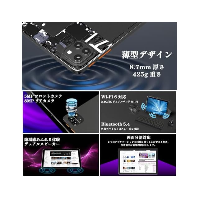 【豪華な装備】タブレットはわずか425g、厚さ7.8mmの軽量・薄型設計で、通勤・通学、旅行などの持ち運びにも最適。専用保護ケースと防眩光フィルムが付属しており、外出先や明るい場所でも画面が見やすく、傷や指紋からもしっかり守ります。日常使用はもちろん、ビジネスや学習用途にもぴったりの一台です。