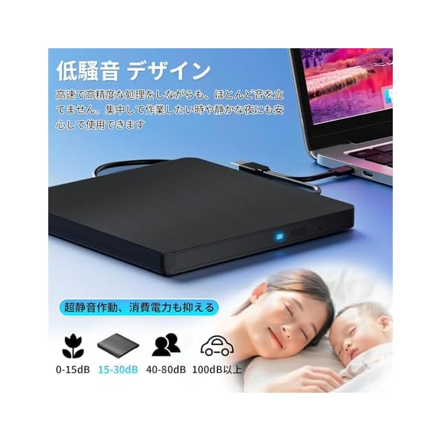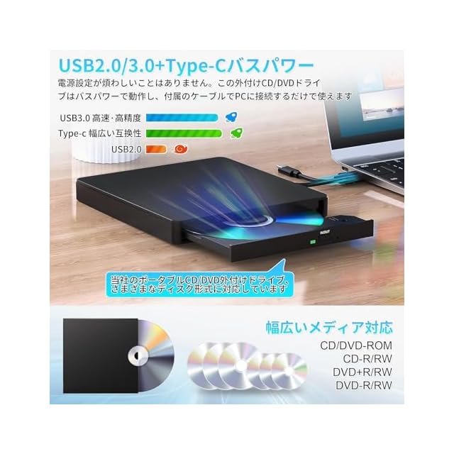 【幅広いメディア対応】 CD プレーヤーは、CD/DVD-ROW、CD-R/RW、DVD+R/RW、DVD-R/RW のディスク形式をサポートします (CD ドライバーは M-DISC もサポートします)。本製品のデータ書き込みモードは専門ソフトをダウンロードする必要があり、純正の書き込みソフトです(非純正の書き込みソフトでは書き込み時にエラーが発生する可能性があります)。 CD を再生するときは、コンピューターにプレーヤーが搭載されているかどうかを確認する必要があります (ない場合は、自分でダウンロードする必要があります。「Cyber PowerDVD 18」プレーヤーはほとんどの CD/DVD を再生できます)。CD/DVD が古すぎるか、または古すぎます。ゴミが付着しているため、ドライバーが認識できない、または読み取り中に停止する可能性があります。読み取り機能を利用するには、ホスト コンピュータの USB C をマザーボードの USB ポートに接続する必要があります。注意: IPad、テレビ、プロジェクター、Blu-ray DVDには適していません。