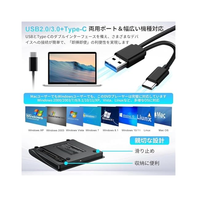 【幅広い機種対応】MacユーザーでもWindowsユーザーでも、このDVDプレーヤーは完璧に対応しています。Windows 2000/2003/7/8/8.1/10/11/XP、Vista、Linuxなど、多様なOSに対応。付属のケーブルでPCに接続するだけで、すぐに使用可能です。WindowsからMac OSまで、さまざまなデバイスにシームレスに対応します((*お知らせ:インターフェイスに接続した後に DVD ボタン (IN/OUT) を取り出すことができない場合は、コンピュータのデスクトップで [この PC] を選択し、[DVD-RW ドライブ] を右クリックして [取り出し] を選択する必要があります。インターフェイスがコンピュータに挿入されていますが、DVD-RW ドライブが認識されません。インターフェイスを取り外して、再度差し込むことができます,または、コンピュータの別のインターフェイスに接続してみてください)