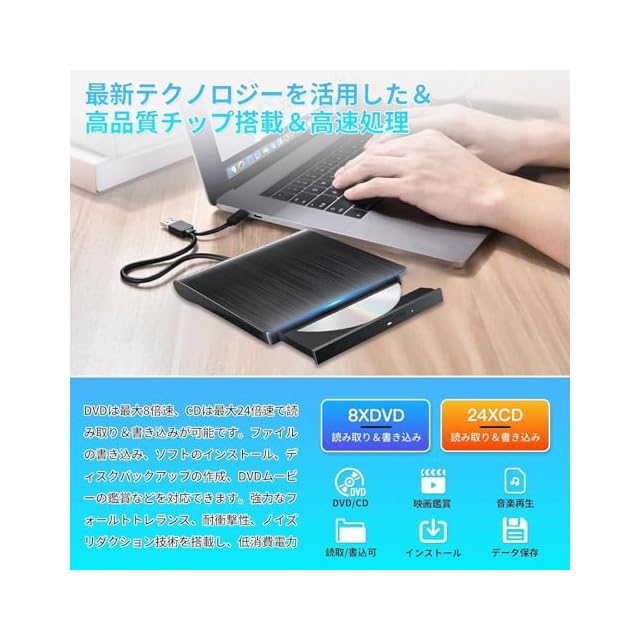 【最新テクノロジーを活用した高品質チップ搭載&高速処理】この外付けCD/DVDドライブは、最新の高品質チップを採用し、データ処理の高速化と精度向上を実現しています。先進的なチップセットにより、ビジネスでの効率的な作業だけでなく、エンターテイメント用途でも驚くほどスムーズな読み込みが可能です。パソコンにUSB2.0/3.0ポートまたはType-Cポートを接続するだけで、この外付けドライブを直ちにご利用いただけます。外部アダプターや電源が不要で、パソコンに接続すると自動的に認識されます。手間のかかるインストール手順が不要なので、気軽にお使いいただけます