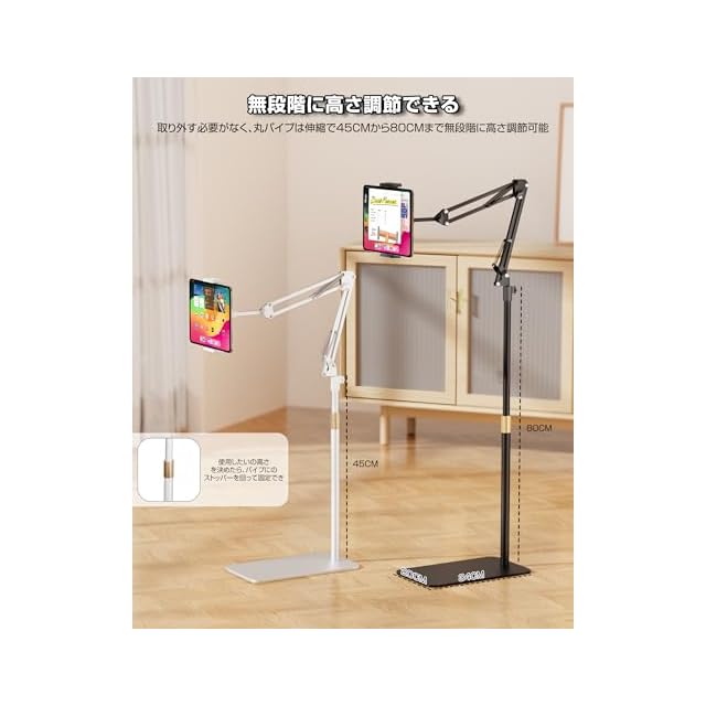 【フロアスタンド・両手解放】本製品は伸縮で高度を調節できるフロアスタンドです。場所を選ばず使える床置きタイプ、寝ながら使用することができます。それにも、挟むホルダー部分は360度回転可能、デバイスの画面を縦向きにも横向きにも変えられ、お好みの角度を調節できます。または、アーム部分を自由に曲がって、お好みの角度や高さを調節し、俯いてスマホを見続ける首の凝り、ストレートネック防止になり、自撮影/動画視聴/リモート会議/動画撮影などの場所に大活躍です。