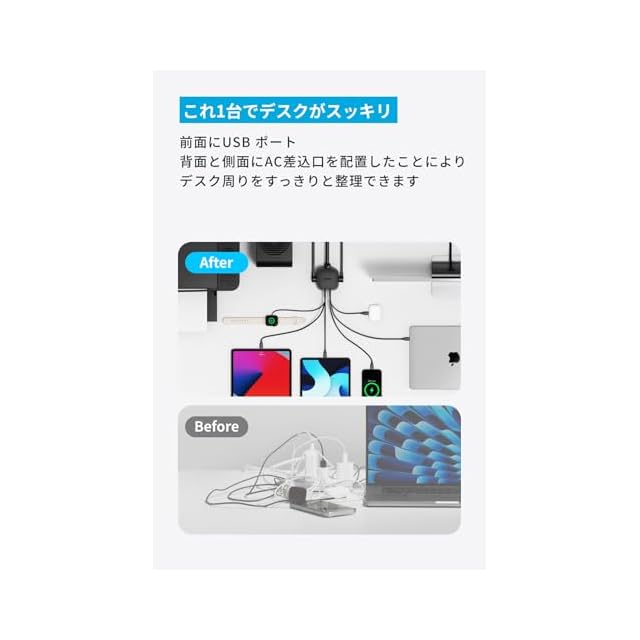 これ1台でデスクがスッキリ:前面にUSB ポート、背面 / 側面にAC差込口を配置したことにより、デスク周りをすっきりと整理できます。