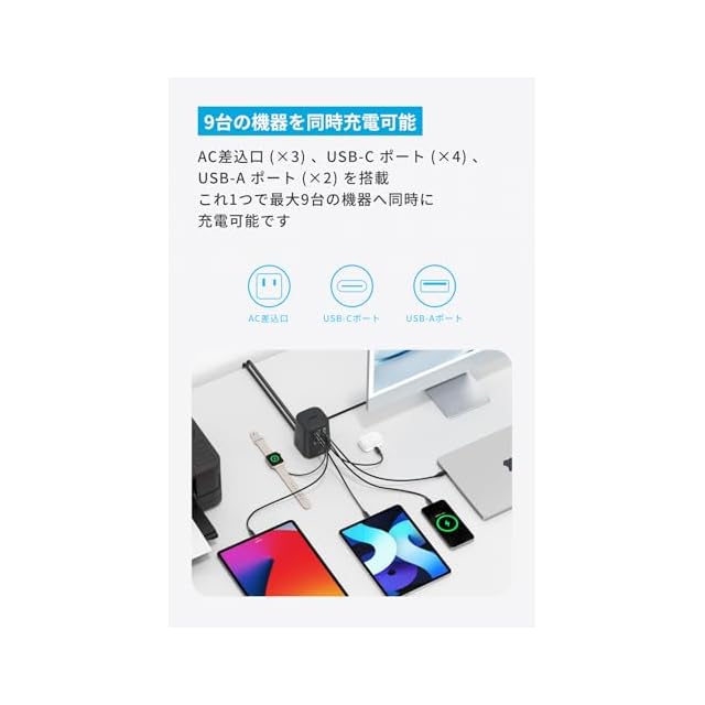 9台の機器を同時充電可能:AC差込口 (×3) 、USB-C ポート (×4) 、USB-A ポート (×2) を搭載。これ1つで最大9台の機器へ同時に充電可能です。