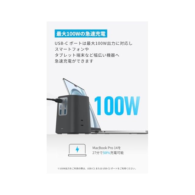 最大100Wの急速充電:USB-C ポートは最大100W出力に対応し、スマートフォンやタブレット端末など幅広い機器へ急速充電が可能です。※100W出力はUSB-C単ポート(USB-C1 / C2)利用時のみ