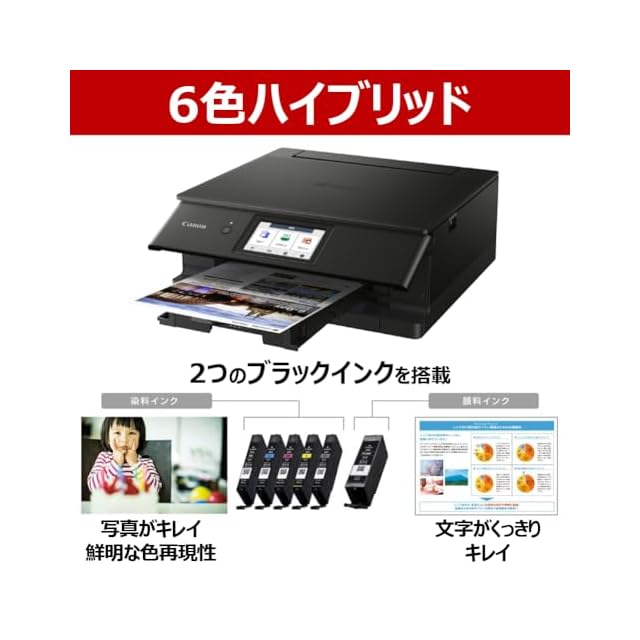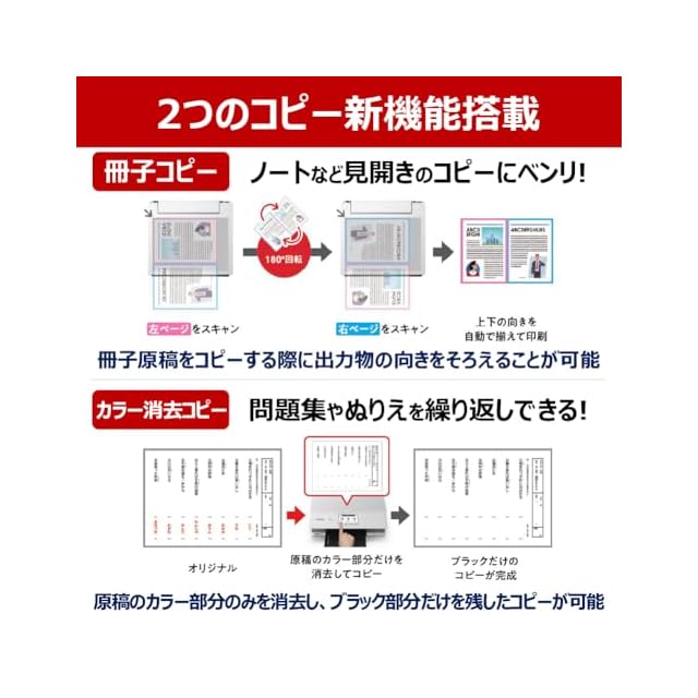 製品特徴:選べる本体カラー(ホワイト・ブラック)、6色インクでスマホで撮った写真も文書も高画質でキレイにプリント、新しいコピー機能(色消しコピー・冊子コピー)搭載モデル。