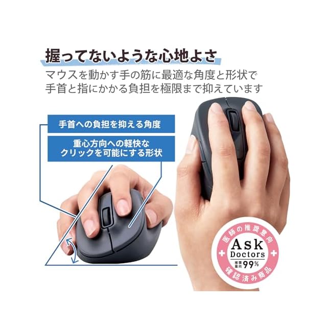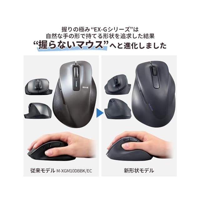 整形外科医との共同開発により自然な手の形のまま使える、握らないマウス“EX-G"シリーズ。手首と指を動かす筋に着目し、マウスを動かす際にかかる身体の負担を極限まで抑えた無線2.4GHz5ボタンマウスです。