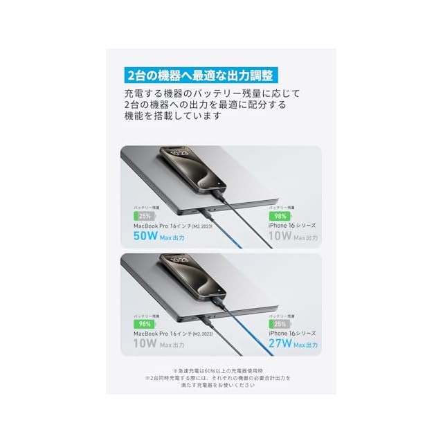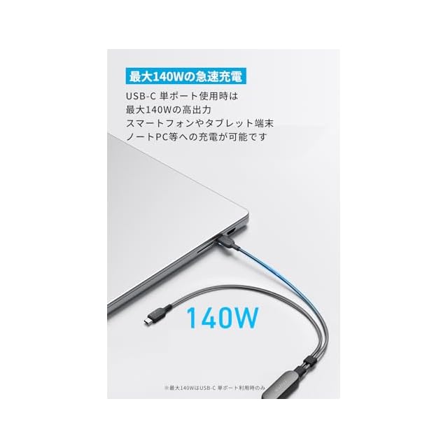 最大140Wの高出力:USB C 単ポート使用時は、最大140Wの高出力。お使いのスマートフォンやタブレット端末、ノートPC等のUSB-C ポート搭載機器へ充電が可能です。