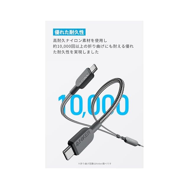優れた耐久性:高耐久ナイロン素材を使用し、約10,000回以上の折り曲げにも耐える優れた耐久性を実現しました。※折り曲げ回数はAnker調べ