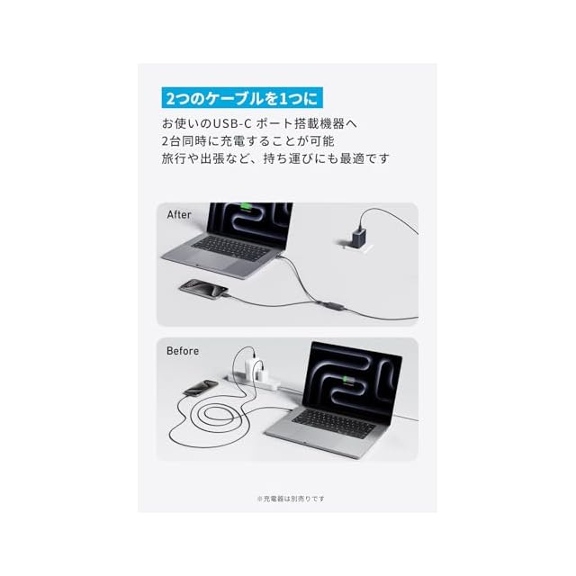 2つのケーブルを1つに:2本のUSB-Cケーブルを1つにまとめました。お使いのUSB-Cポート搭載機器へ2台同時に充電することが可能。旅行や出張など、持ち運びにも最適です。