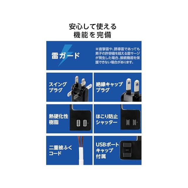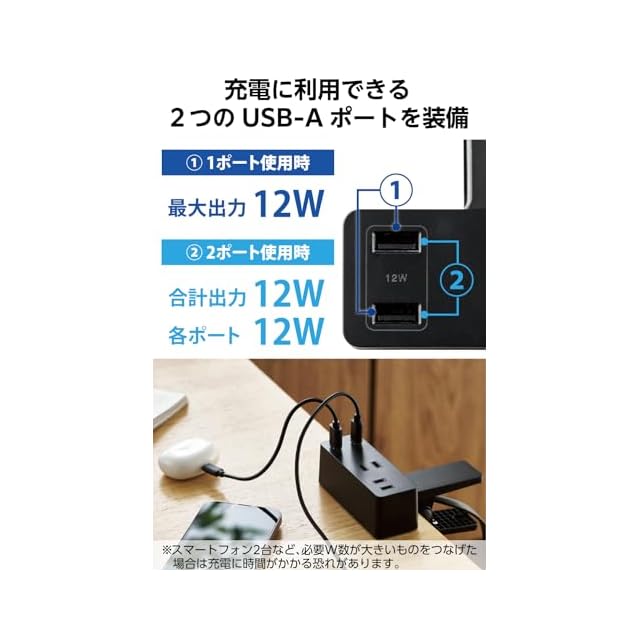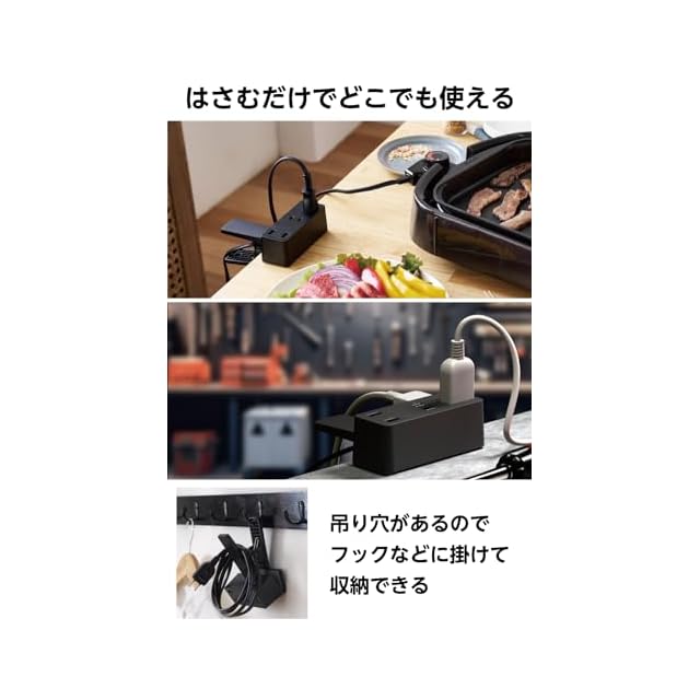 机などに挟んで使えるクリップ機構を搭載した、USB-Aポート付きの電源タップです。常に挟んだままでの使用だけでなく、タップを常設できないダイニングテーブルなどに一時的に電源を設置できます。ホットプレートなどの調理機器の利用や、テレワークや宿題をする際に便利です。コードの長さは約3mです。