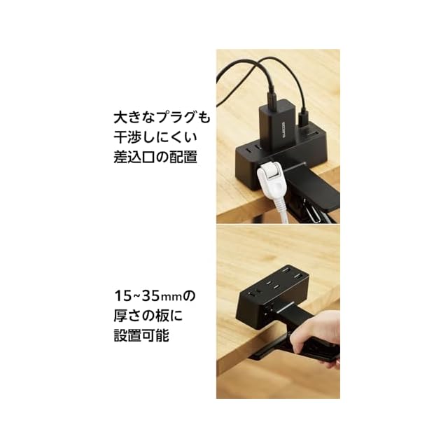 約15~35mmの厚さの板に設置が可能です。設置する際はUSB-Aポートが上向きになるようにしてください。