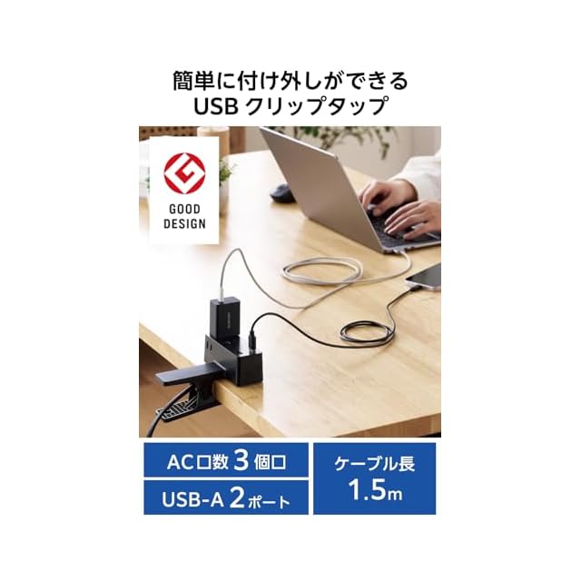 机などに挟んで使えるクリップ機構を搭載した、USB-Aポート付きの電源タップです。常に挟んだままでの使用だけでなく、タップを常設できないダイニングテーブルなどに一時的に電源を設置できます。ホットプレートなどの調理機器の利用や、テレワークや宿題をする際に便利です。コードの長さは約1.5mです。
