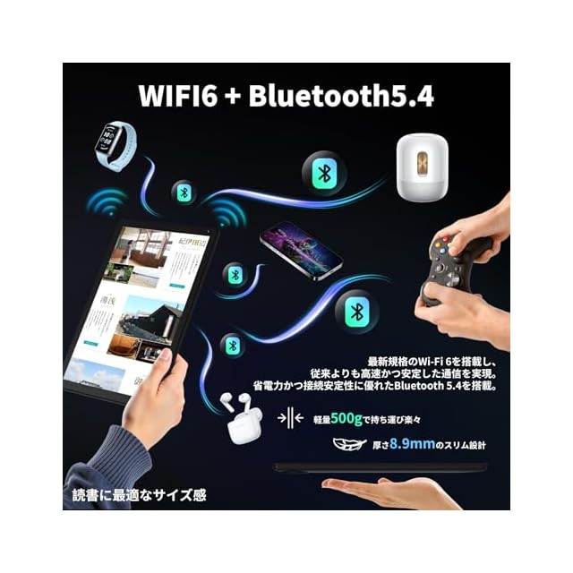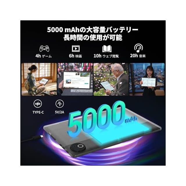 【WIFI6・BT 5.4・5000mAh・5MP/8MPカメラ・無線投影】2.4Ghz/5Ghz WiFi と Bluetooth 5.4 を搭載しており、どこにいても接続を維持できます。5000mAh大容量バッテリーで、映画やドラマ、音楽鑑賞などを長時間安心してご利用できます。USB Type-C +Type-Cのヘッドフォンジャックを備え、充電しても音楽聞いても互いに邪魔しません、様々なニーズに対応できます。フロントカメラ( 500万画素)、リアカメラ( 800万画素)でいつでも撮影をお手軽に楽しめます。お子様がタブレットを使用する量を制御するのに役立ち、お子様が適切に学習し、楽しむのに役立つ便利な方法を保護者に提供します。