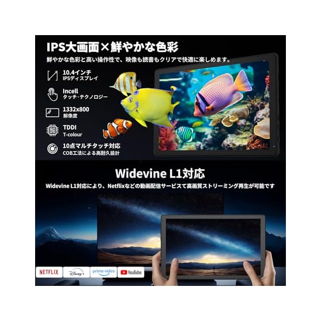【タブレット10.4インチ・1332x800解像度・Widevine L1対応・T-Colour】10インチタブレットよりも表示領域が広く、動画視聴や電子書籍も快適。一方で11インチよりも軽量&コンパクトで、持ち運びや片手操作もしやすいバランスの取れたサイズです。1334x800の高解像度ディスプレイにより、写真や動画を鮮やかに映し出します。T-Colour映像技術が色彩を最適化し、自然で臨場感のある映像体験を実現します。10点マルチタッチに対応しており、滑らかな操作性でゲームや学習、ビジネス用途まで快適に使用可能。さらに、Widevine L1対応でNetflixなどの高画質配信をフルHDで楽しめます。