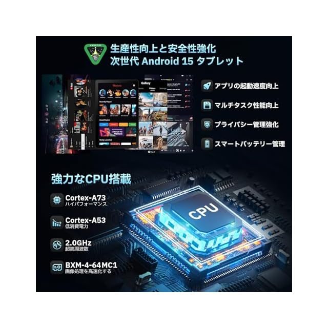 【最新のAndroid 15 タブレット・8400mAh大容量バッテリー・18W PD急速充電】最新のAndroid 15 OSを搭載し、アプリの起動速度は従来比で最大20%向上。画面切り替えもよりスムーズになり、日常の操作が快適に進みます。さらに、セキュリティとプライバシー保護機能が一層強化され、大切なデータも安心して管理可能。高性能2.0GHz駆動の8コアCPUを搭載し、動画視聴やSNS、ゲームなどのマルチタスクも軽快に処理。さらに、8400mAhの大容量バッテリーにより長時間駆動を実現し、外出先でも安心。さらに18W PD急速充電に対応しているため、従来より約2倍速く充電でき、短い時間でしっかり使える準備が整います。