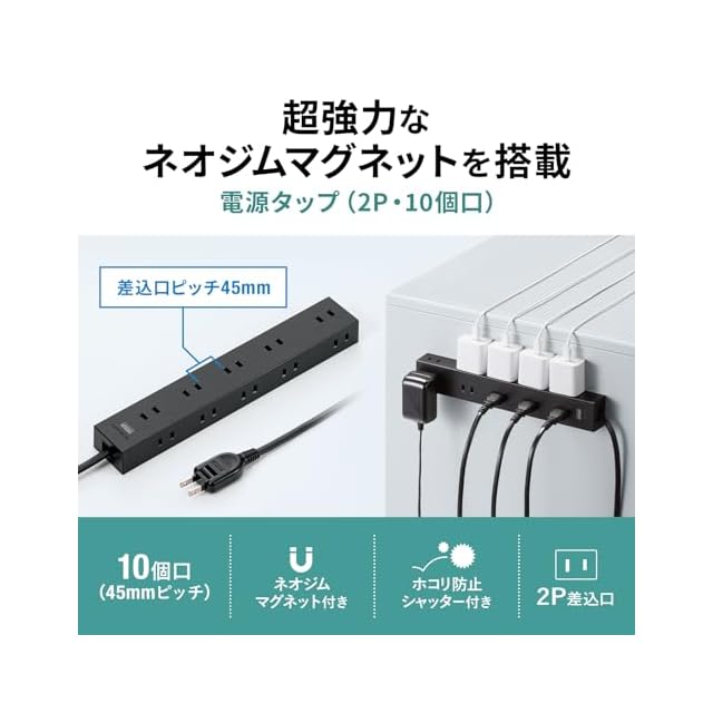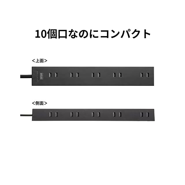 サンワサプライ(Sanwa Supply) 電源タップ 10個口・2P (1m) たくさん挿せるレイアウト 強力ネオジムマグネット ほこりシャッター スイングプラグ ブラック TAP-2210-1BK | つむぎ屋