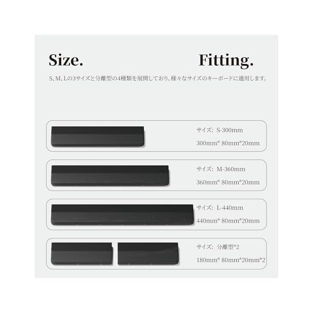 【幅広く適用】S、M、Lの3サイズと分離型の4種類を展開しており、様々なサイズのキーボードに適用します。PFUHHKB、東プレREALFORCE、FILCO、Majestouch、Razer、Logicool、Macbookなど、ほぼすべてのキーボードにお使い頂けます。オフィスでの使用はもちろん、在宅勤務の方にもおすすめで、テレワークの環境を整え、PC作業の効率アップにも繋がります。ゲーム好きな方にも適用し、スムーズな操作でより楽しいゲーム体験を実現します