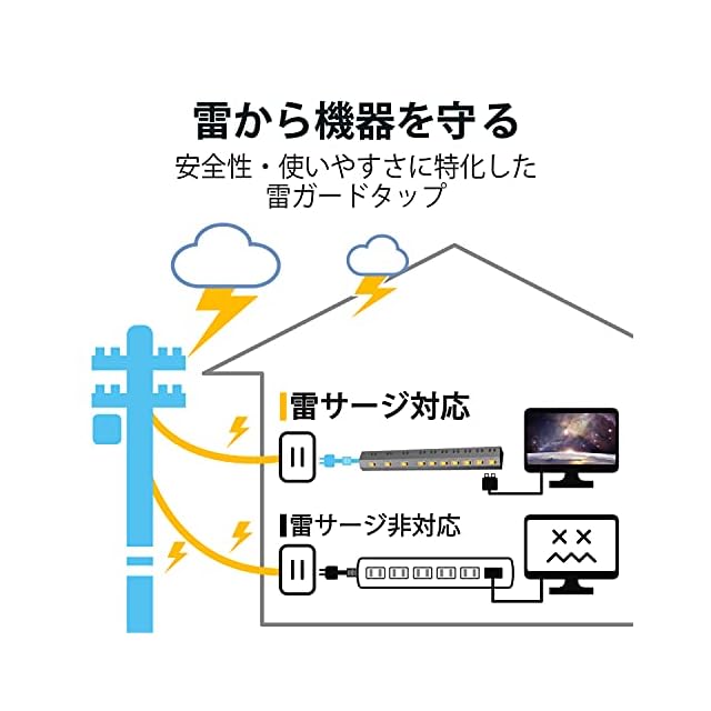 誘導雷による12500Vまで(JEC210/212規格に基づく数値)の雷サージを吸収する素子(バリスタ)を搭載し、接続機器を保護します。※受けた電圧や回数により性能は劣化します。