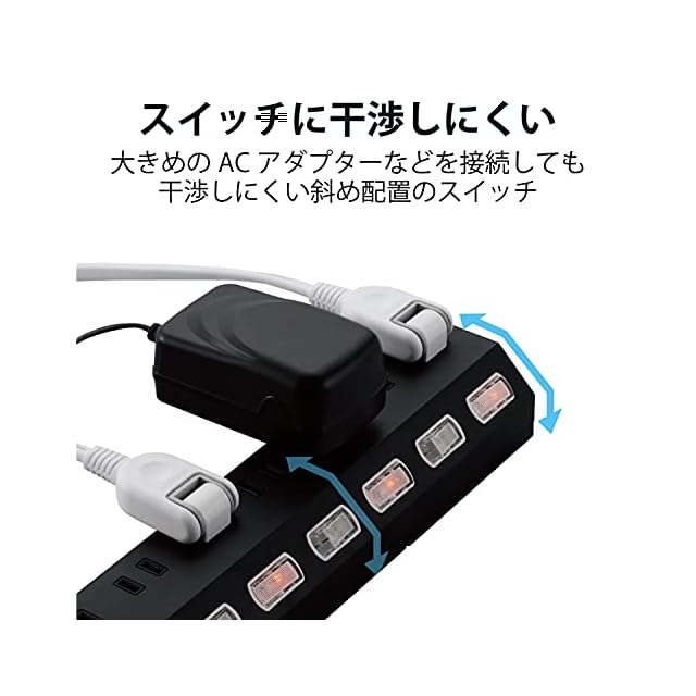 個別スイッチは大きめのACアダプターなどを接続しても干渉しにくい斜め配置となっています。