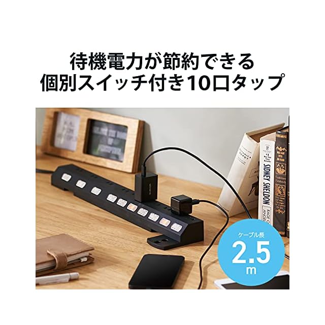 差込口毎にON/OFF切り替えができ、待機電力を節約できる個別スイッチ付きの2ピン式10個口タップです。