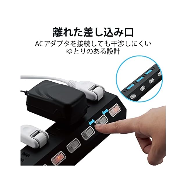 大きなACアダプターなどでも利用しやすいよう、片端の連続する3個口は隣り合う差込口との中間距離が57mmと大きめに離した配置となっています。