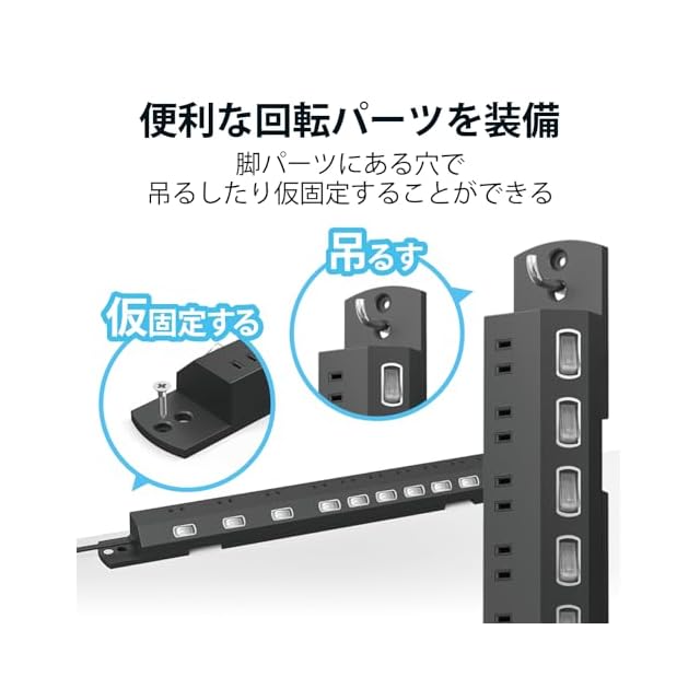 脚パーツには直径10mmの吊り穴と直径5mmのネジ固定穴、底面には十字型のダルマ穴を備えており、付属のタッピングネジで壁などに吊ったり、固定して利用できます。