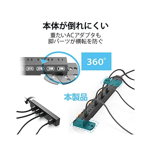 脚パーツを展開することで重いACアダプターなどを接続した際もタップが横転しにくくなります。