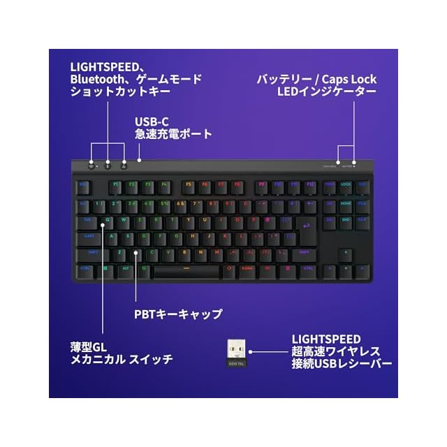 耐摩耗性に優れ、光透過特性を向上させる高品質な薄型PBTキーキャップを採用/確かな打鍵感があり正確に押下できる「タクタイル」スイッチ(茶軸)を搭載/プレミアムな手触り、高いパフォーマンスとモダンで洗練されたデザインを実現