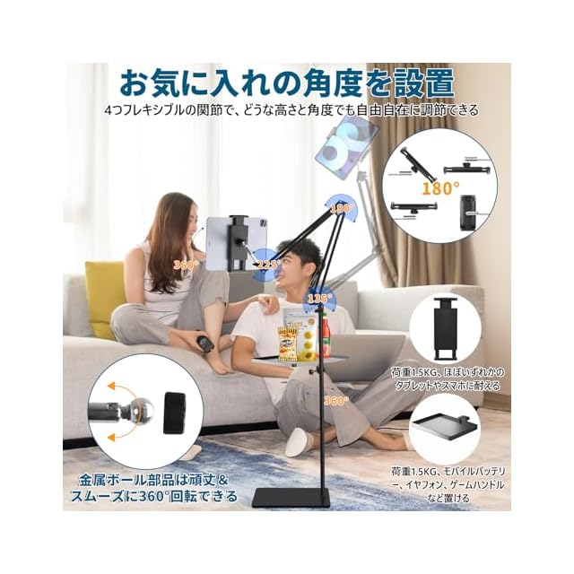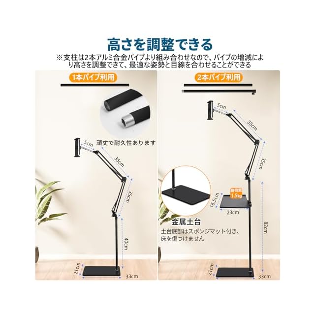 【高さ調整・自由移動・様々場合に大活躍】 床置きタブレット スタンド の支柱は2段式のパイプにより組み合わせなのでパイプ増減により高さを調整できます。どうな身長の方でも最適な目線を合わせます。特に全身自撮りや、生放送に最適です。本体重は2.6kgだけ、楽に移動できます。オフィス、寝室、キッチン、バスルームなどいろいろな場所に適用。日常映画鑑賞がもちろん、エクササイズ、店頭、展示会ブース、受付の案内などに幅広くお使いいただけます。
