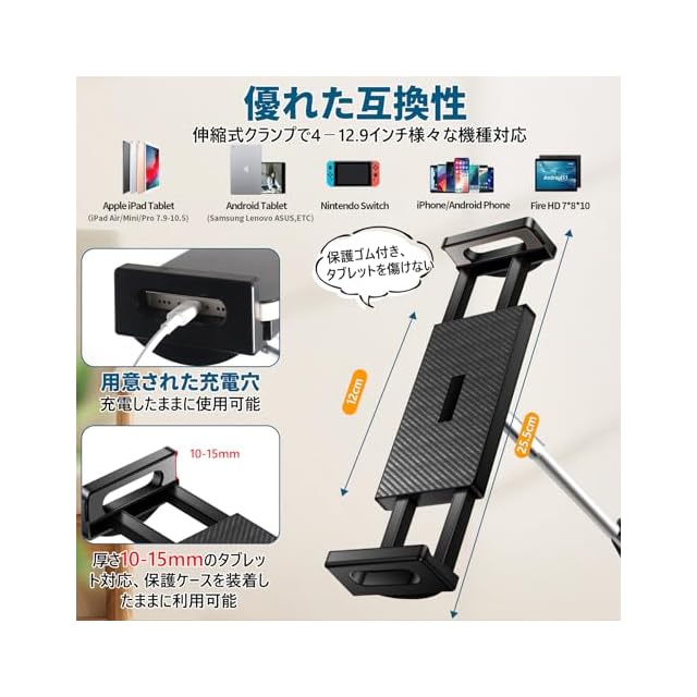 【4.5-12.9インチ機種対応・充電穴用意】ipad スタンド の伸縮式クリップにより、12-26cmまで拡張可能し、4.5-12.9インチの全てiPad/iPadPro/iPhone/android/surface/Kindle/Fire HD8/Switch などさまざまな機種に対応します。寝室での動画鑑賞、YouTubeを見て、在宅勤務、オンライン授業など、どんな場所でもご好みのように使用可能です。それ以外、クリップ両側は充電穴を用意されて充電したままに利用可能します。また、クリップは1.5cm厚さのタブレットが対応し、保護ケースを装着したままに利用可能です。